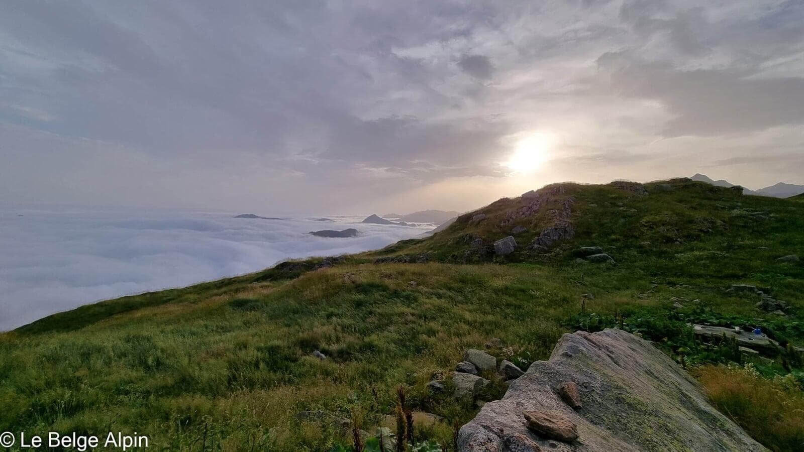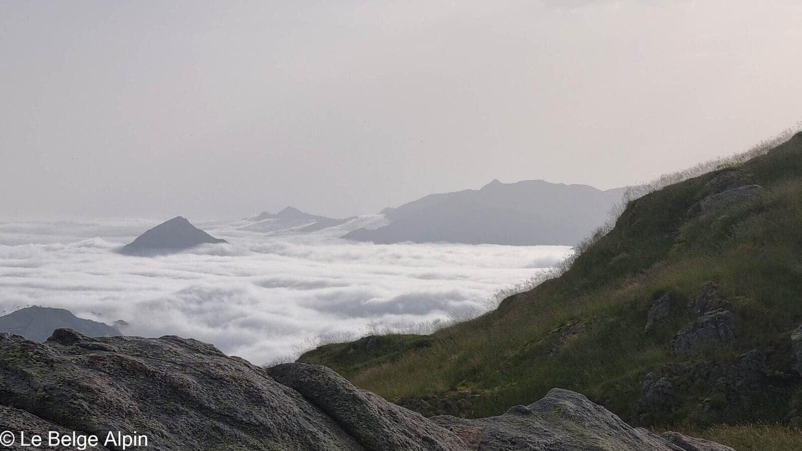 C’est le moment qui rachète tout. La mer de nuages s’étend en bas, les sommets alentour émergent comme des îles, le soleil décline lentement. On oublie la fatigue, les sacs trop lourds, l’orientation perdue dans les dalles. C’est pour ces 20 minutes qu’on est venu en fait — même si on ne le savait pas.