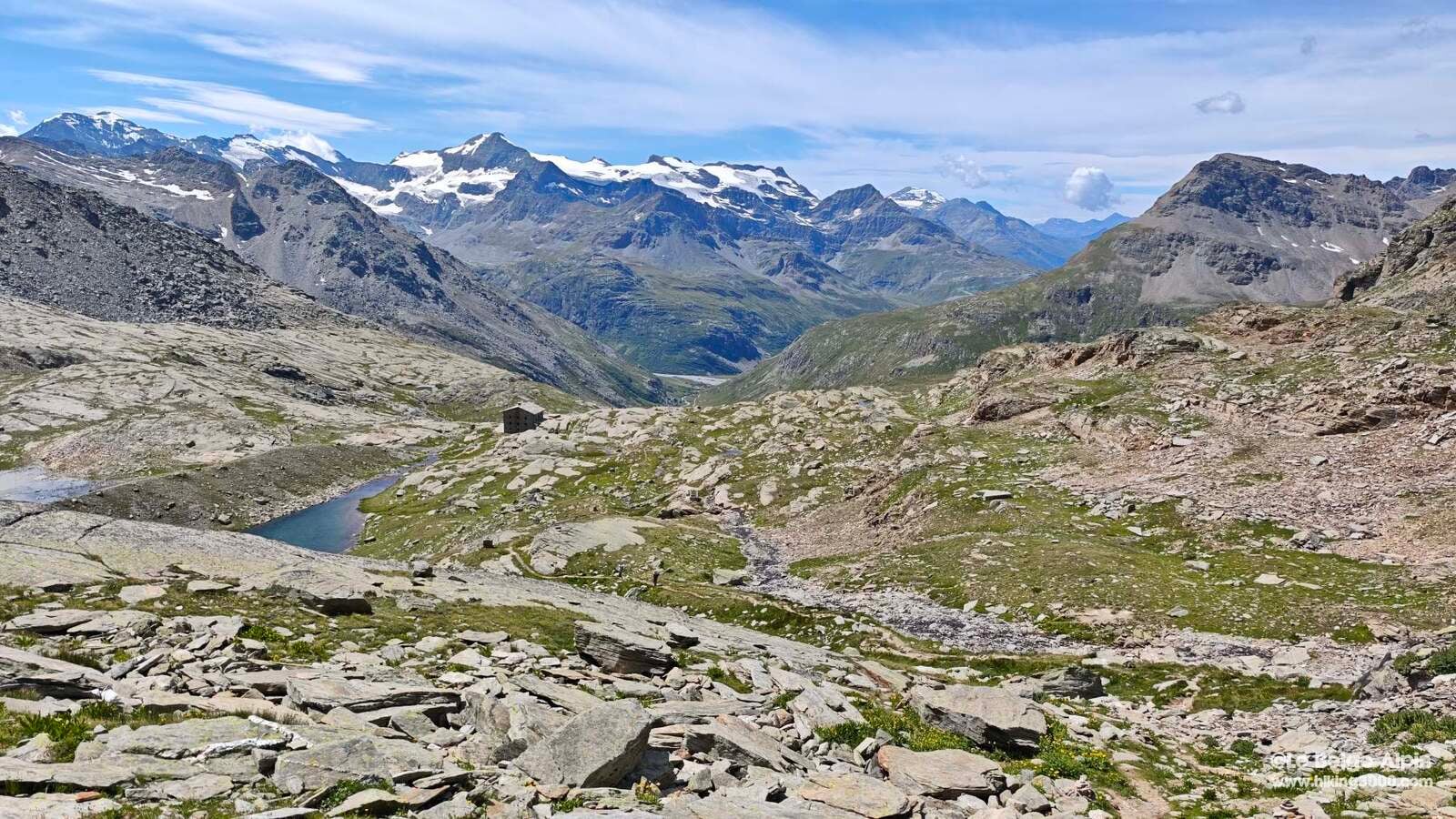 Depuis le hameau de l'Écot à Bonneval-sur-Arc, une longue montée au Refuge du Carro puis au col (3149m) qui veille sur la frontière italienne. Lacs d'altitude, moraine et forêt de cairns.