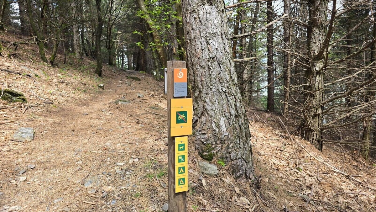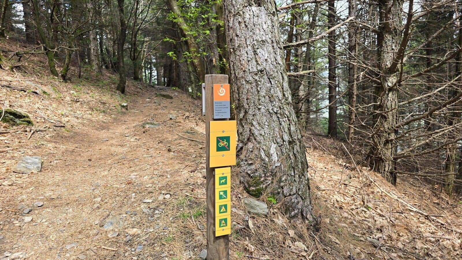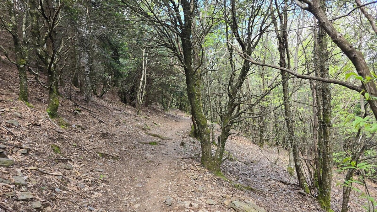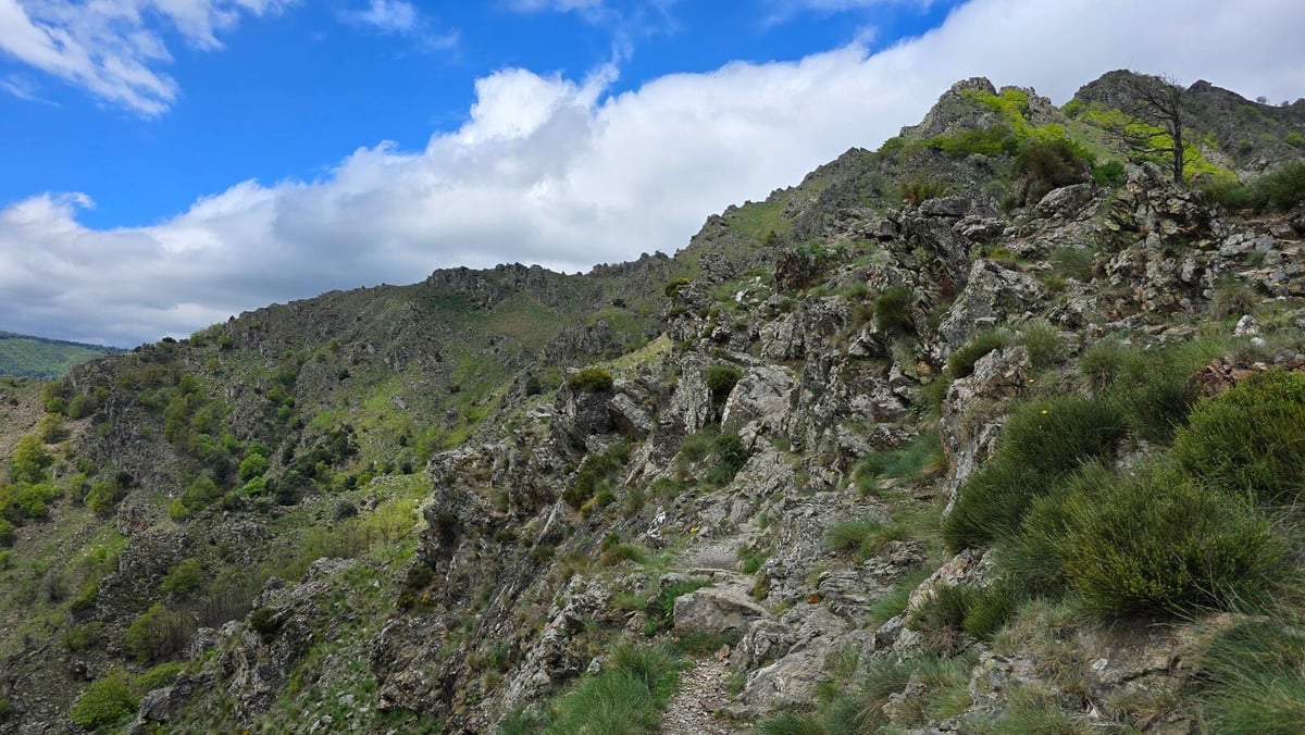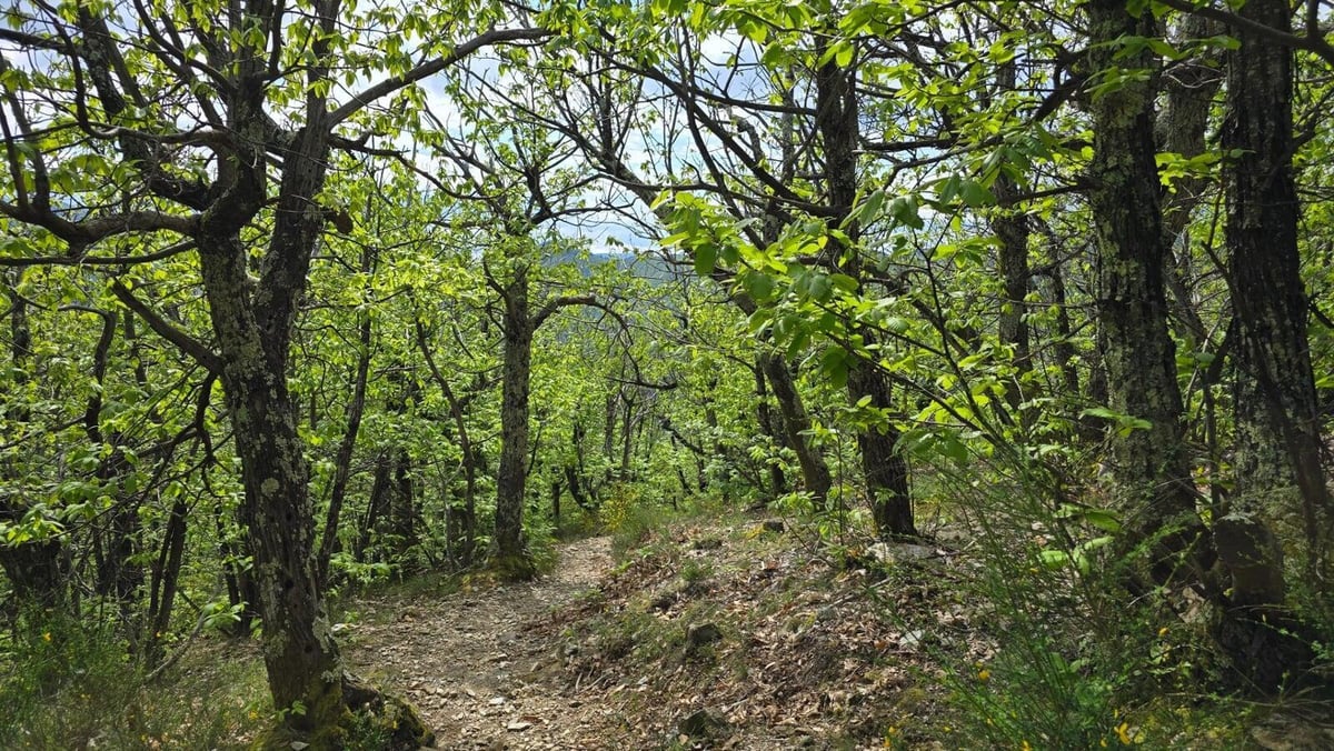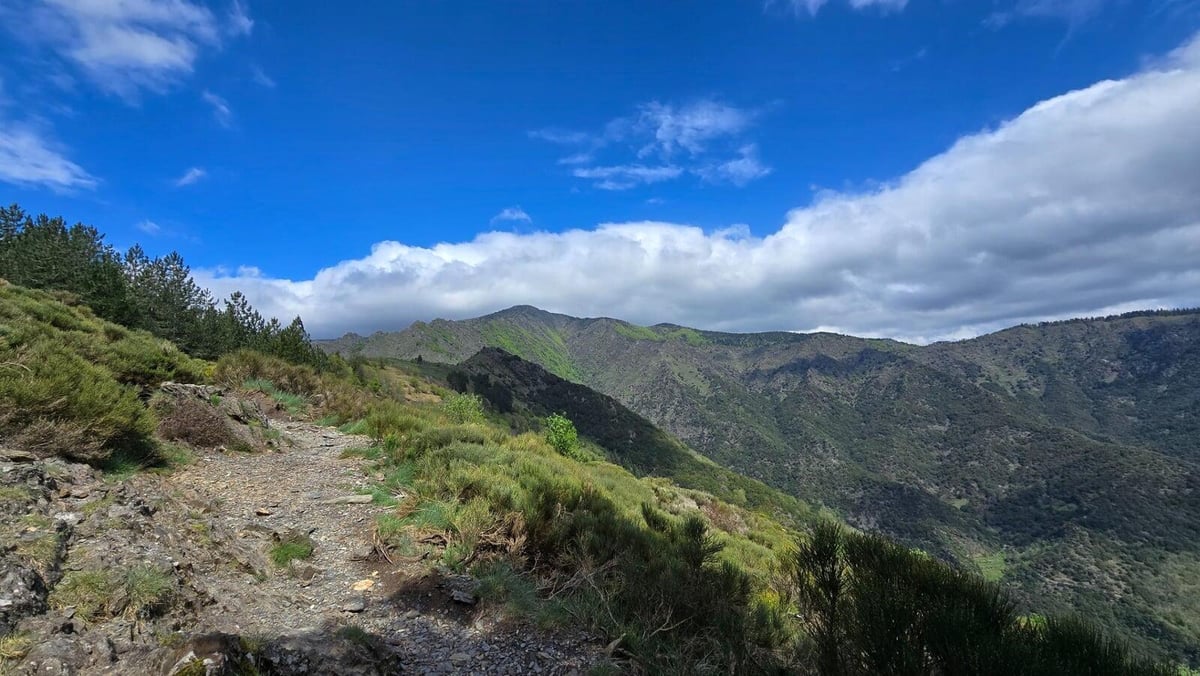 On traverse d’abord la châtaigneraie cévenole, typique de ce versant méditerranéen. Plus on monte, plus la végétation change : hêtres, pins, puis les landes d’altitude balayées par le vent. Le sentier est bien balisé, la pente reste régulière mais continue — on ne lâche pas le rythme.