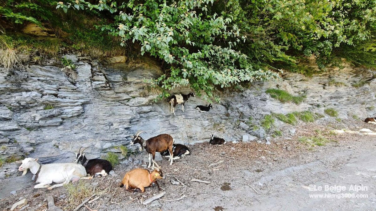 Le départ s’effectue depuis le parking au pied du massif, dans un décor bucolique de prairies alpines. Chalets savoyards, fermes en activité, chèvres dans les chemins — on est immédiatement dans l’ambiance. Au pied du massif, un panneau d’info présente les deux itinéraires : le Golet de la Trouye (alpin, sans câbles) et le Pas de l’Ours (câblé, plus technique). Je prends la version câblée.