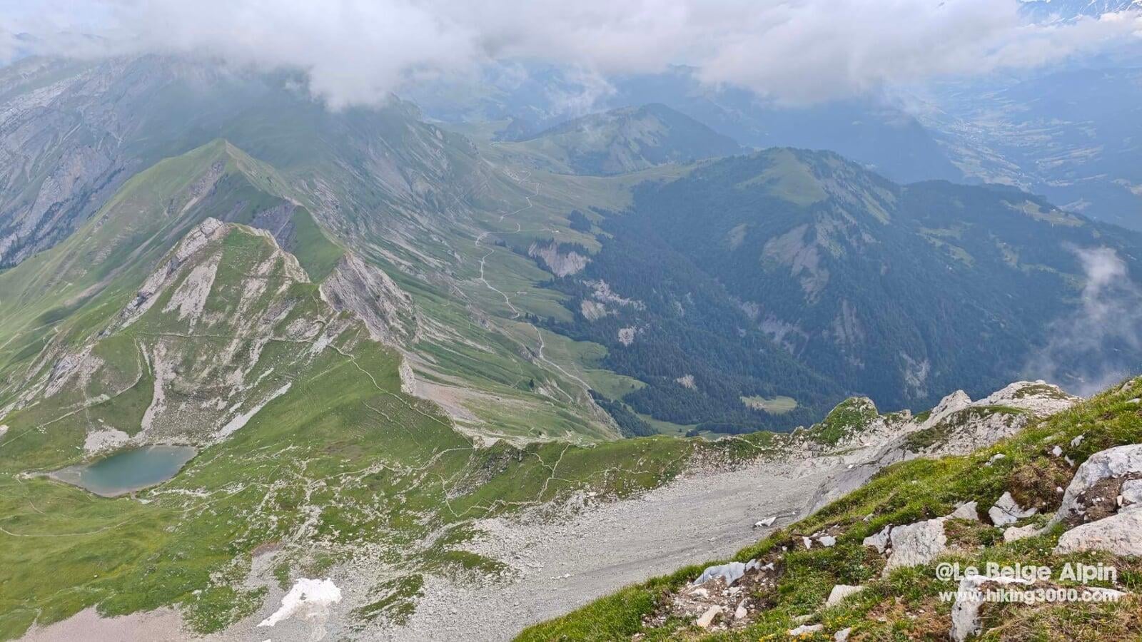 Après le sommet, la descente s’amorce en direction du Pas de l’Ours, un col discret mais redouté pour sa configuration orientée nord. À cette époque de l’année (fin juin), des névés peuvent encore être bien présents, recouvrant les sentiers ou les câbles.