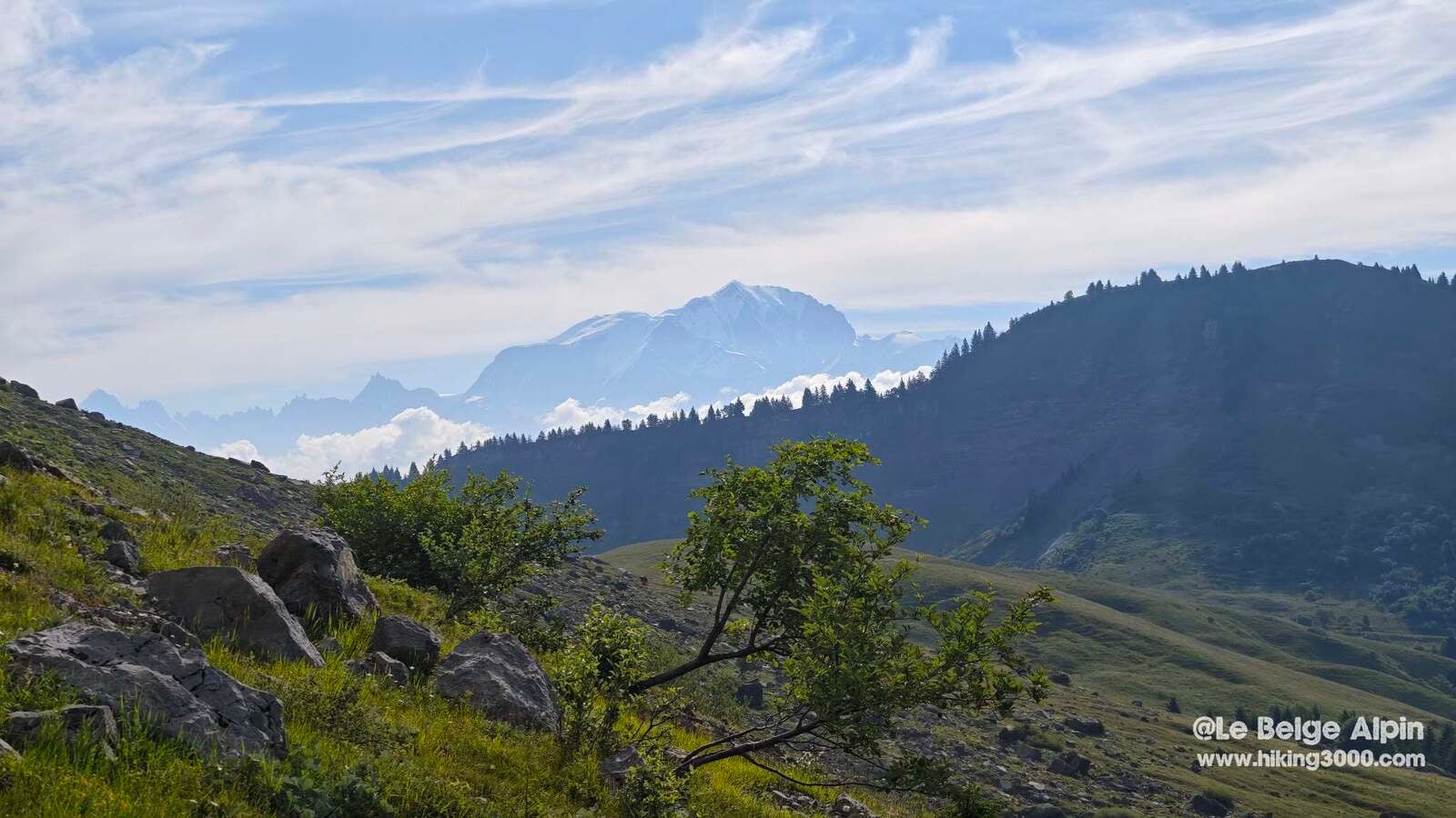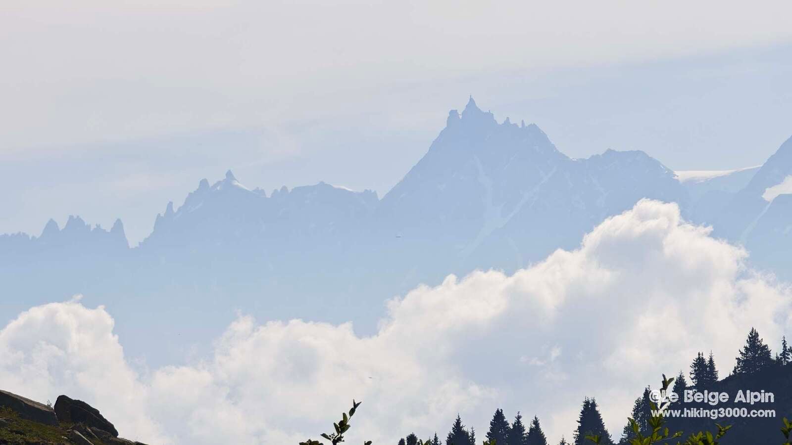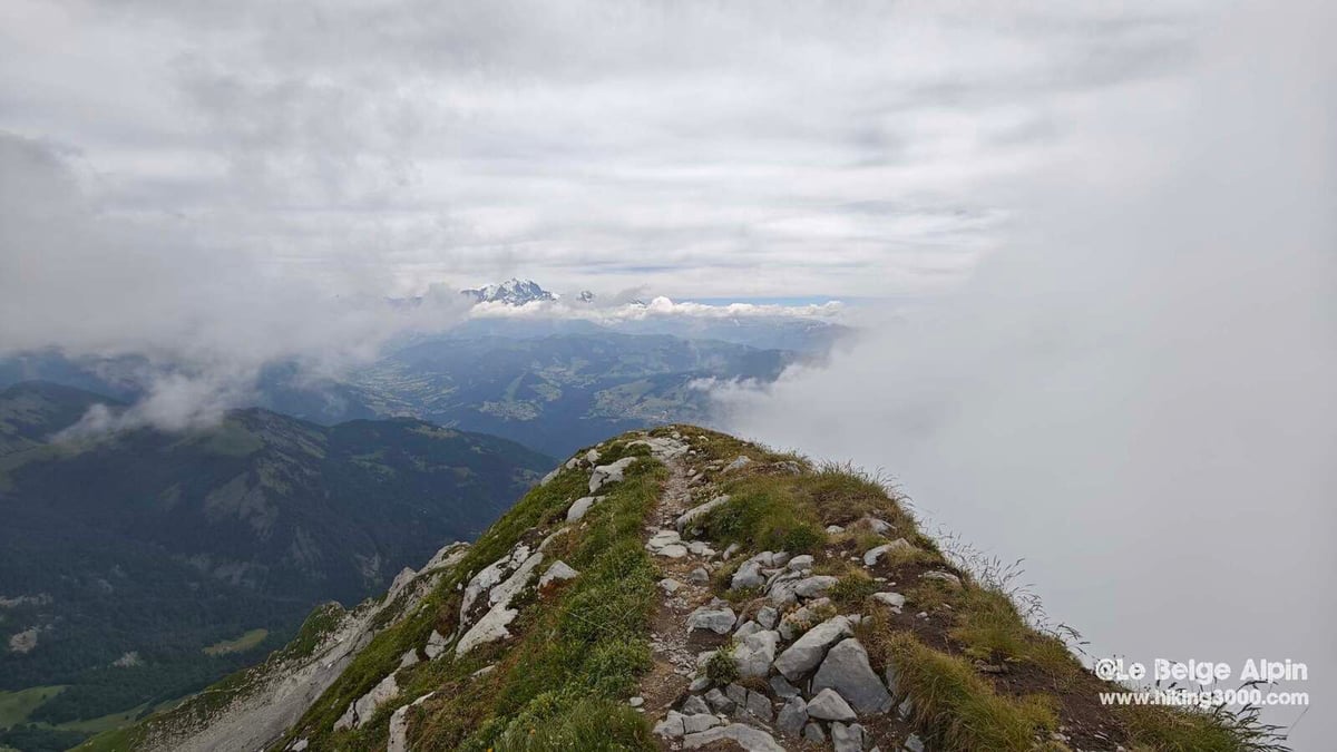 Le 27 juin où je l’ai refait, quelques nuages jouaient encore avec les aiguilles, mais le Mont Blanc est sorti juste au bon moment — impossible de ne pas s’arrêter un long moment au sommet pour le regarder.
