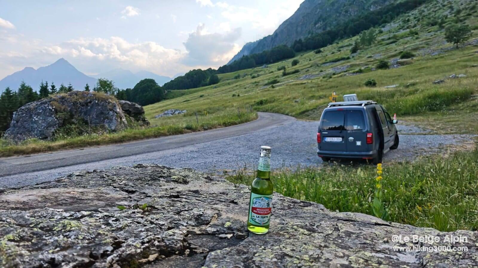 De retour au van avec une Mont-Blanc bien fraîche posée sur un rocher — non, ce n’est pas une mise en scène, c’est la récompense juste au bon moment. Une boucle parfaite : effort, sensations câblées, panorama plein cadre, et retour serein.