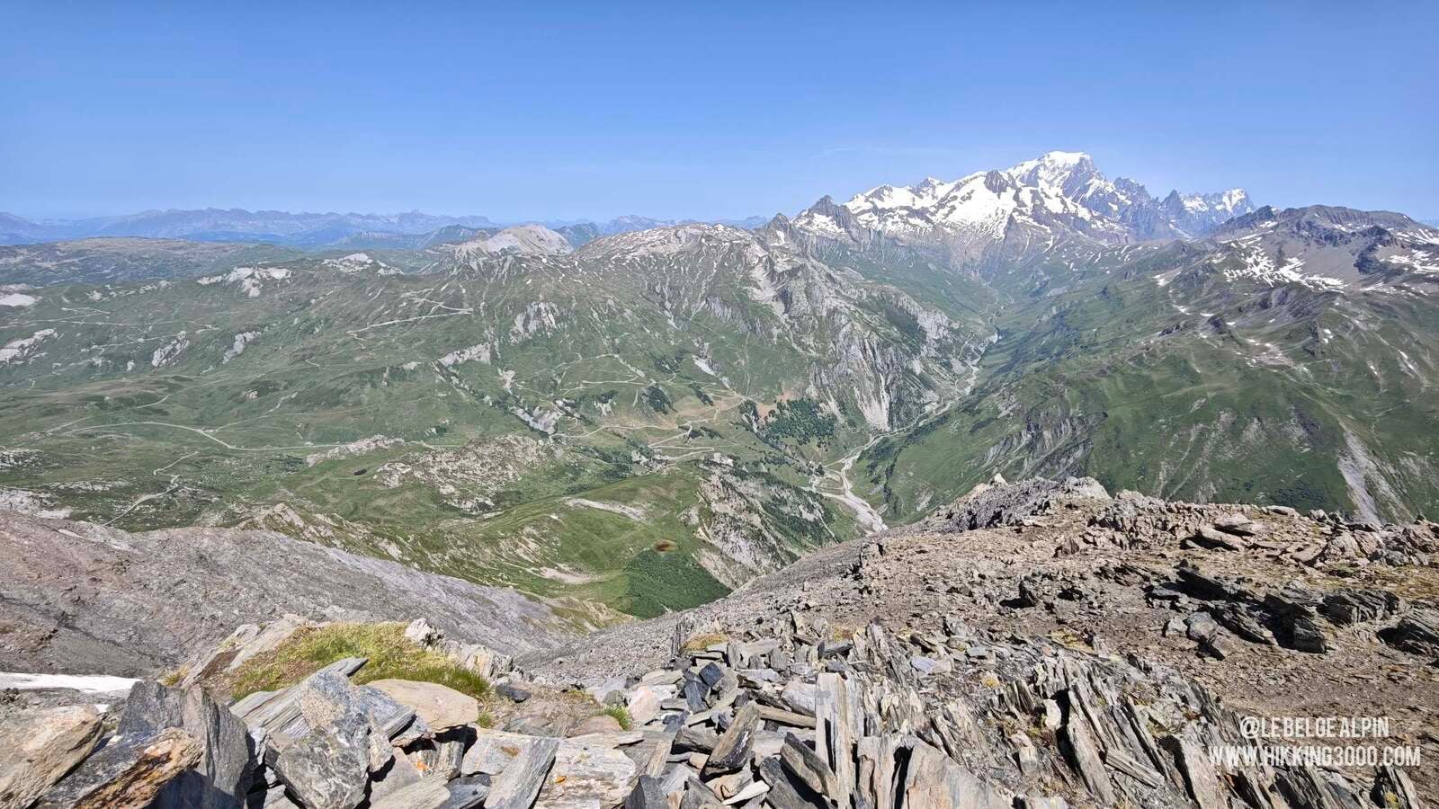 Et quelle récompense ! Au sommet, la vue se déploie sur les Aravis et les massifs voisins, la Vanoise, l’Italie, une vue à couper le souffle sur la partie italienne du massif du Mont Blanc, les Écrins au loin, le tout dans une ambiance presque minérale. On se croirait au beau milieu d’une course alpine, bien plus haut qu’on ne l’est vraiment. C’est ce genre de sommet qui ne paie pas de mine sur la carte… mais qui laisse un vrai souvenir.