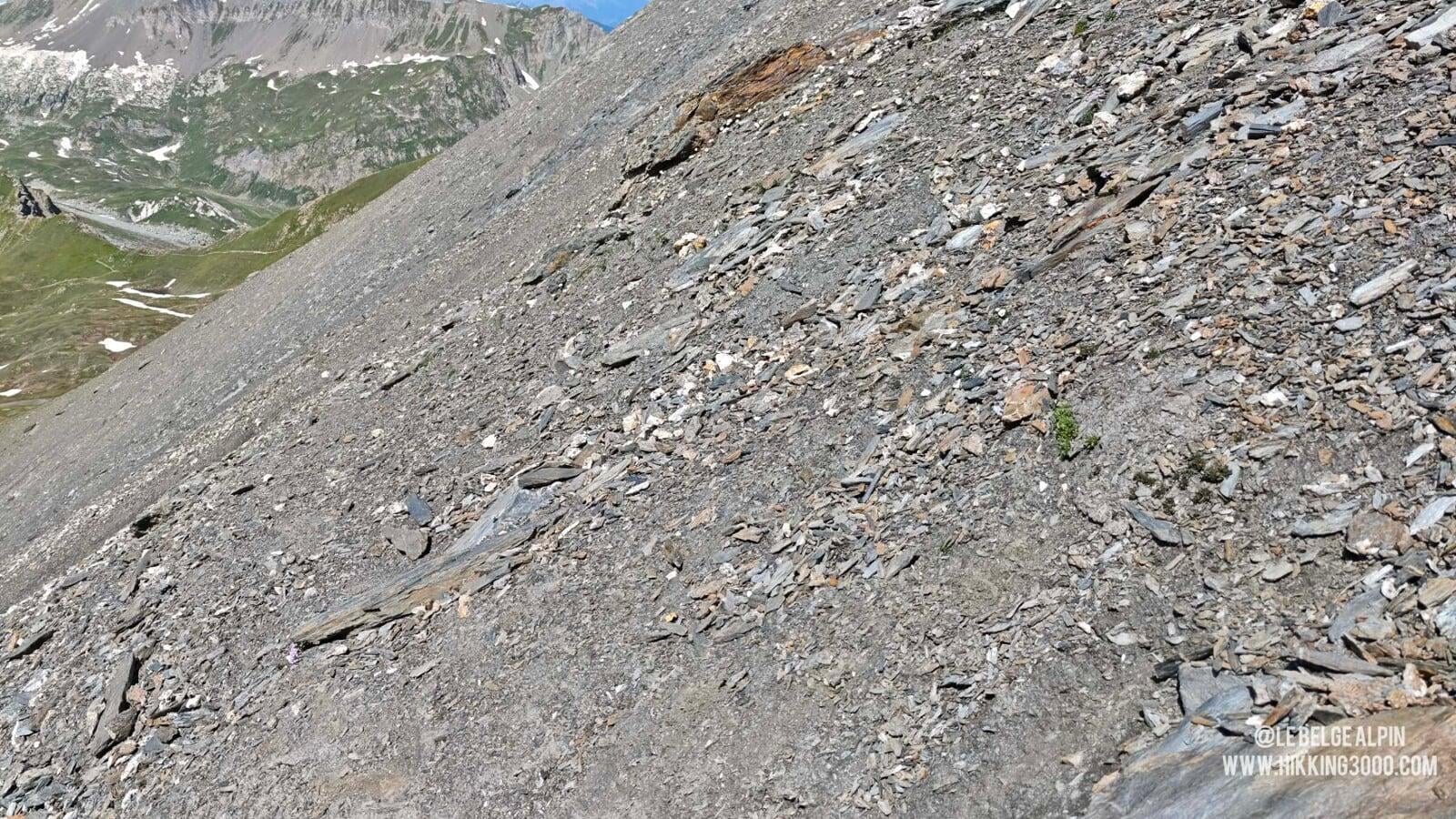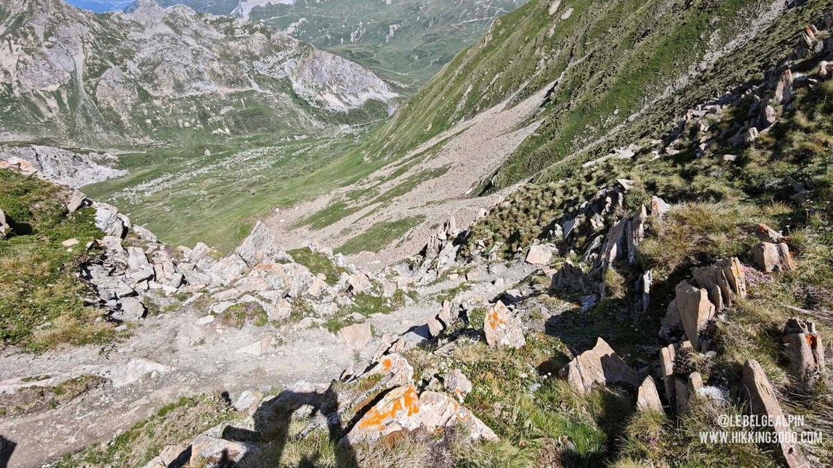Après le col, l’ambiance devient plus engagée. Le sentier disparaît par endroits, remplacé par des pentes de terre raides, sur lesquelles j’ai dû tailler des petites marches pour caler mes appuis sur certains passages. Ensuite vient un pierrier très instable, pas trop difficile à la montée, mais bien plus piégeux à la descente. Il faut avoir un pied sûr, une vraie lecture de terrain, et de quoi improviser : pas de cairns ici (ils ne tiendraient pas), c’est à vous de tracer votre ligne et d’anticiper la stabilité de chaque pas.