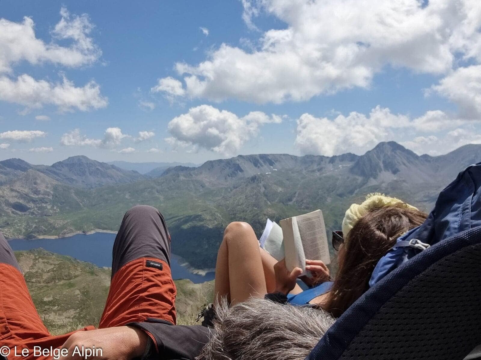À 2842 m, le vent est supportable, le soleil plus cuisant qu’on ne le croit. On a pris notre temps là-haut, sortir un bouquin au sommet d’une frontière naturelle a quelque chose de délicieusement contemplatif.